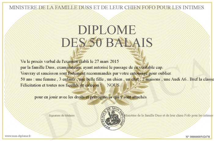 Envoyez par email votre Diplôme des 50 balais personalisé