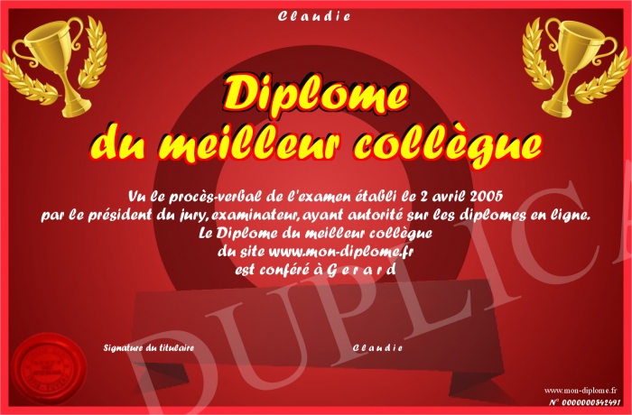 Envoyez par email votre Diplome du meilleur collègue personalisé
