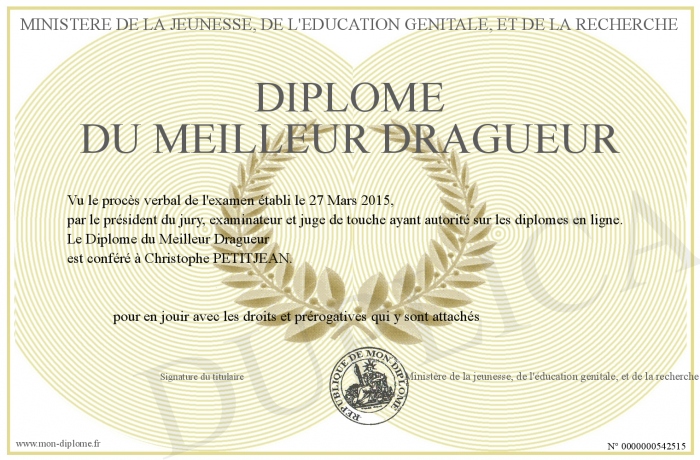 Envoyez par email votre Diplôme du Meilleur Dragueur personalisé