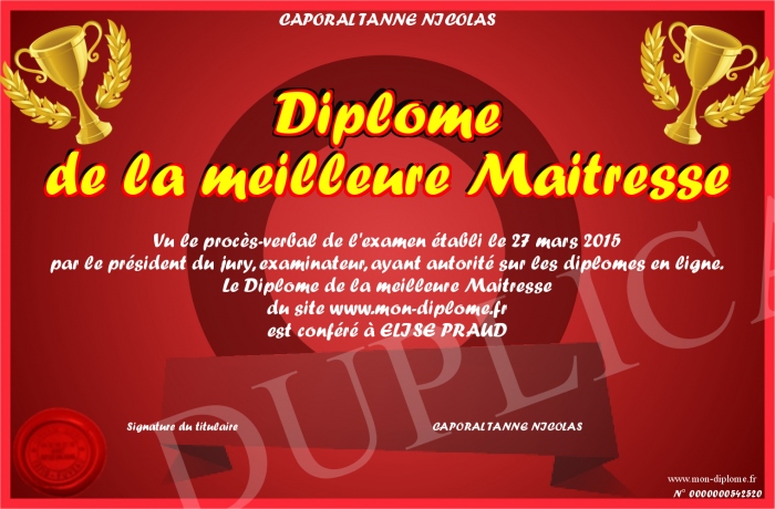 Envoyez par email votre Diplome de la meilleure Maitresse personalisé