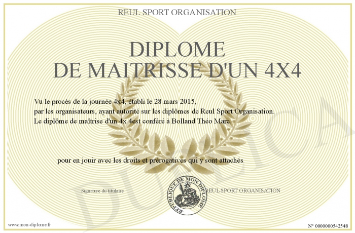 Envoyez par email votre DIPLOME DE MAITRISSE D'UN 4X4 personalisé