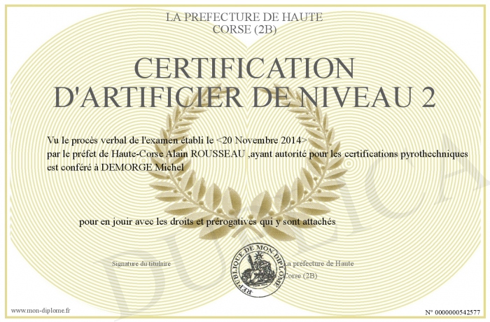 Envoyez par email votre certification d'artificier de niveau 2 personalisé