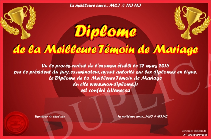 Envoyez par email votre Diplôme de la Meilleure Témoin de Mariage personalisé