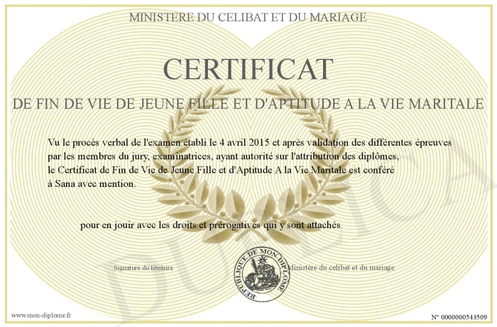 Envoyez par email votre certificat de fin de vie de jeune fille et d'aptitude a la vie maritale personalisé