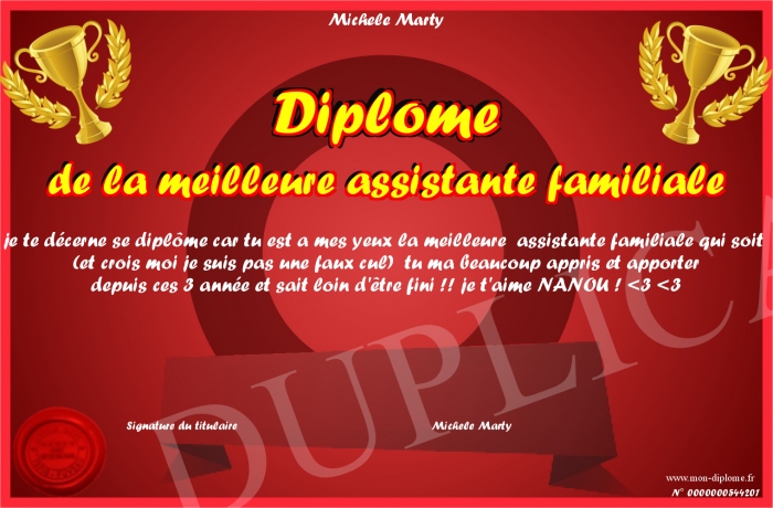 Envoyez par email votre Diplôme de la meilleure assistante familiale personalisé