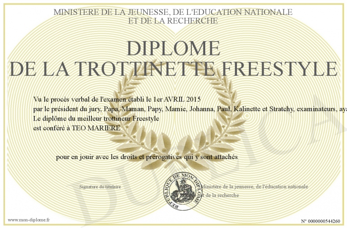 Envoyez par email votre DIPLOME DE LA TROTTINETTE FREESTYLE personalisé