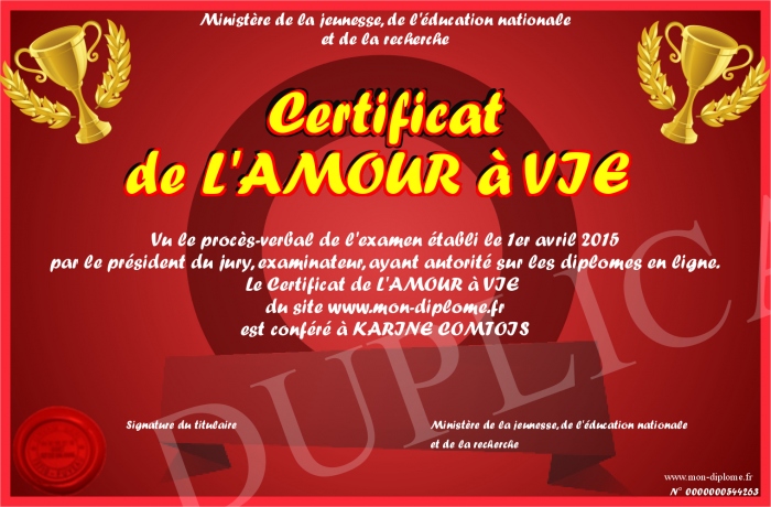 Envoyez par email votre Certificat de L'AMOUR à VIE personalisé