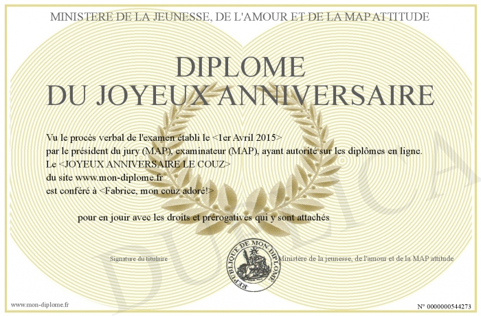 Envoyez par email votre Diplôme du JOYEUX ANNIVERSAIRE personalisé
