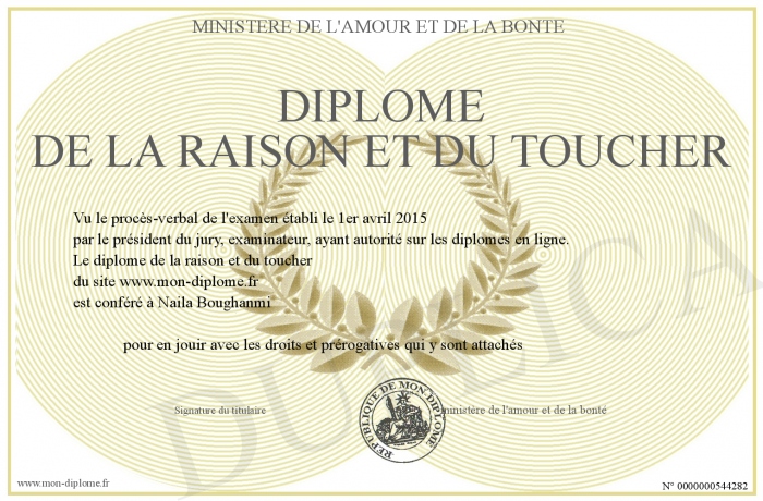 Envoyez par email votre diplome de la raison et du toucher personalisé