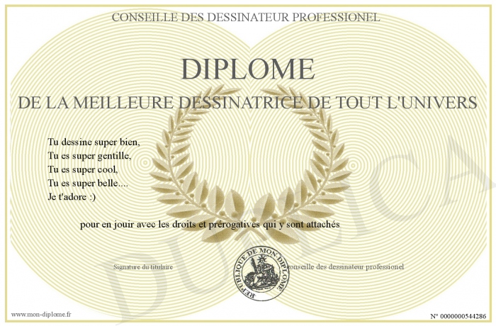 Envoyez par email votre Diplôme de la meilleure dessinatrice de tout l'univers personalisé