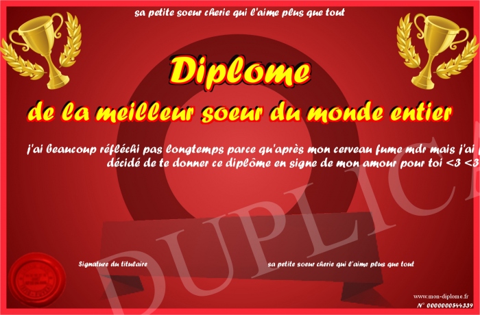 Envoyez par email votre Diplôme de la meilleur soeur du monde entier personalisé