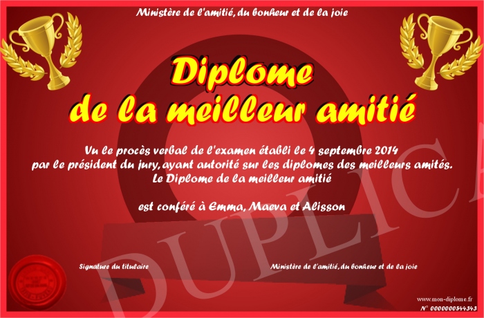 Envoyez par email votre Diplome de la meilleur amitié personalisé