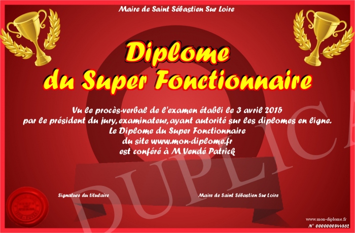 Envoyez par email votre Diplôme du Super Fonctionnaire personalisé