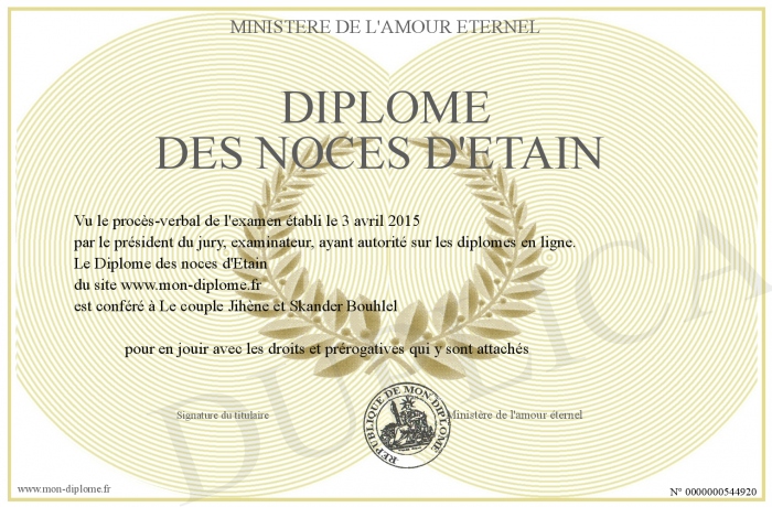 Envoyez par email votre Diplôme des noces d'Etain personalisé