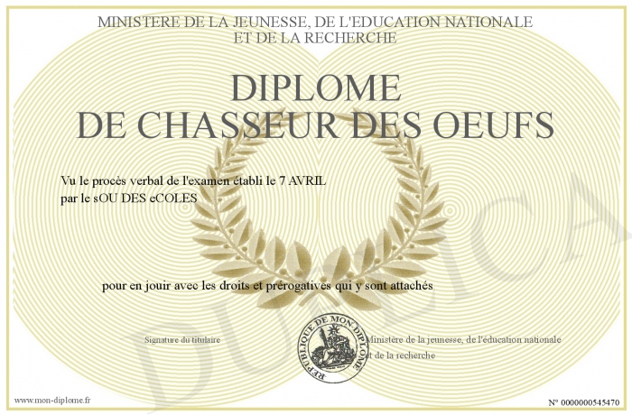 Envoyez par email votre Diplôme DE CHASSEUR DES OEUFS personalisé