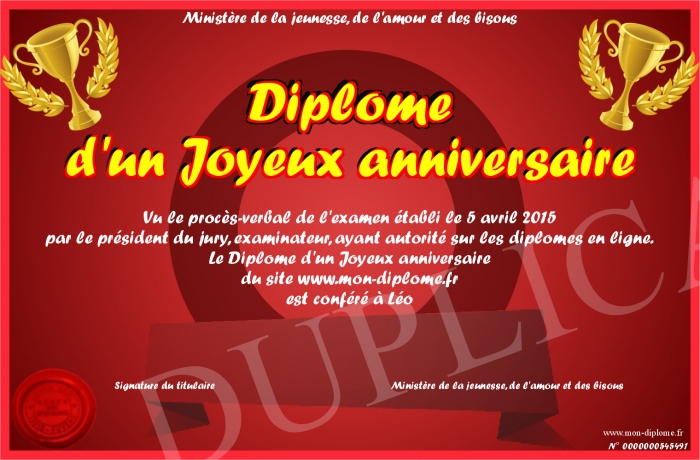 Envoyez par email votre Diplôme d'un Joyeux anniversaire personalisé