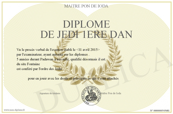 Envoyez par email votre Diplôme de JEDI 1ere Dan personalisé