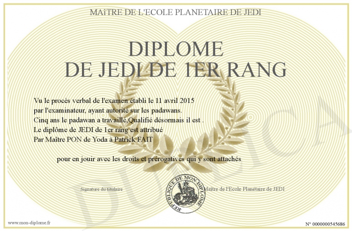 Envoyez par email votre Diplôme de Jedi de 1er Rang personalisé