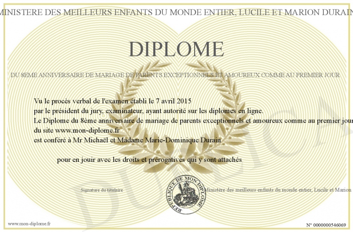 Envoyez par email votre Diplôme du 8ème anniversaire de mariage de parents exceptionnels et amoureux comme au premier jour personalisé
