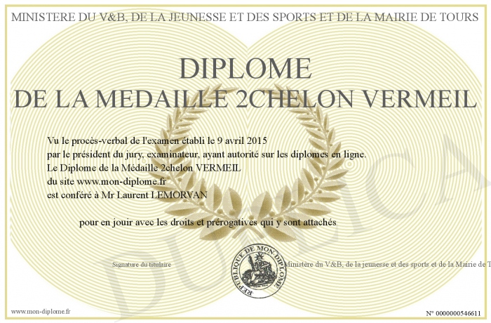 Envoyez par email votre Diplôme de la Médaille 2chelon VERMEIL personalisé