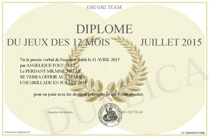Envoyez par email votre Diplôme du jeux des 12 mois JUILLET 2015 personalisé