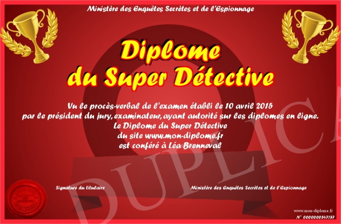 Envoyez par email votre Diplôme du Super Détective personalisé