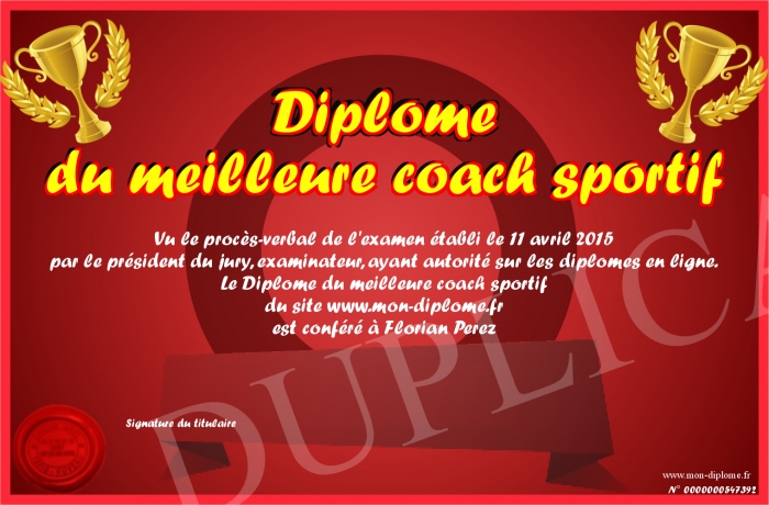 Envoyez par email votre Diplôme du meilleure coach sportif personalisé