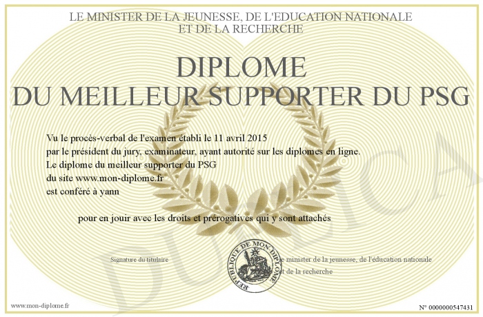 Envoyez par email votre diplôme du meilleur supporter du PSG personalisé