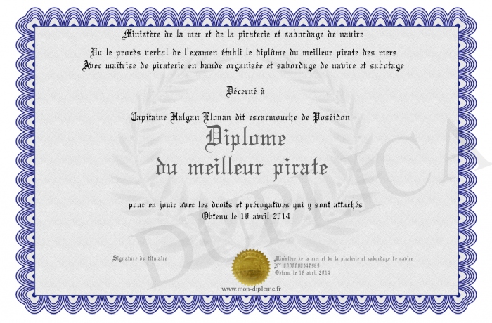 Envoyez par email votre Diplôme du meilleur pirate personalisé