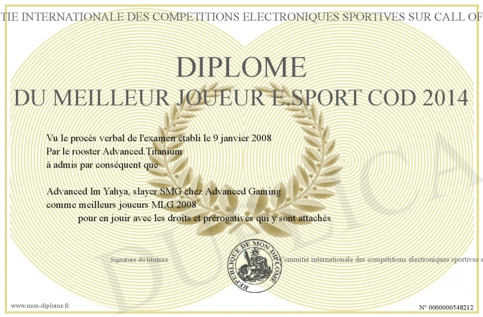 Envoyez par email votre Diplôme du meilleur joueur e.Sport COD 2014 personalisé
