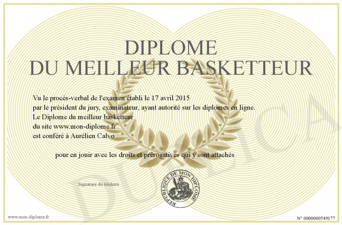 Envoyez par email votre Diplôme du meilleur basketteur personalisé