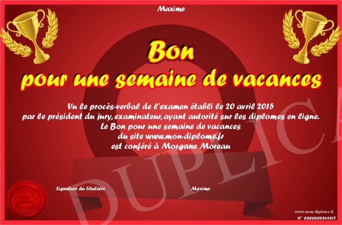 Envoyez par email votre Bon pour une semaine de vacances personalisé