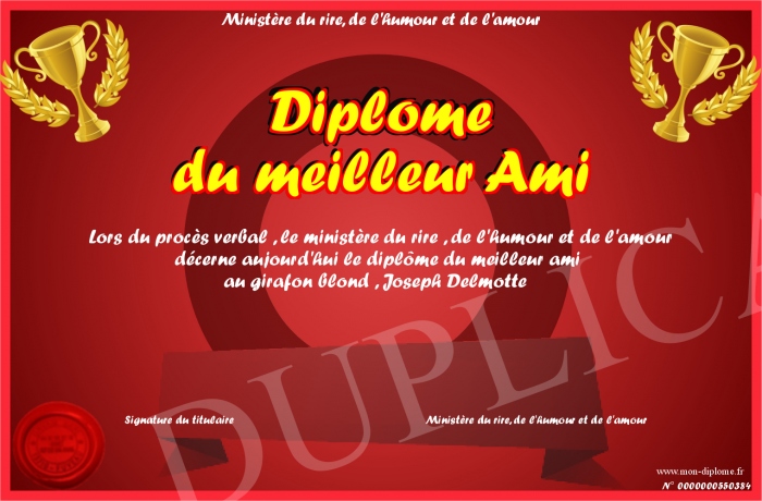 Envoyez par email votre Diplome du meilleur Ami personalisé
