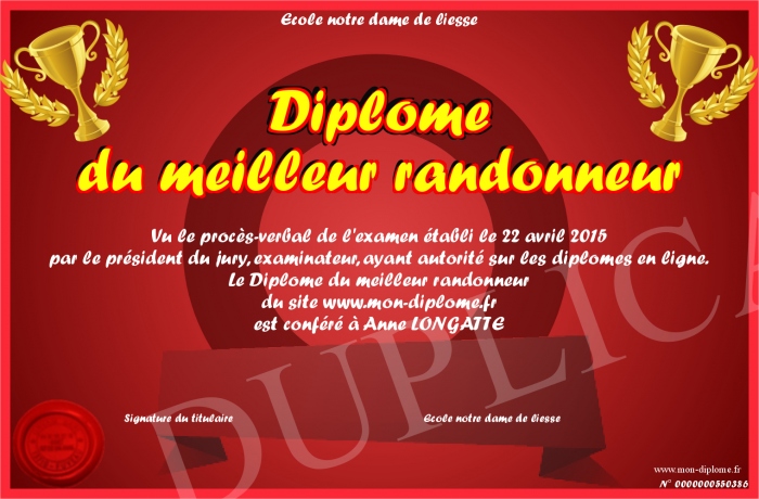 Envoyez par email votre Diplôme du meilleur randonneur personalisé