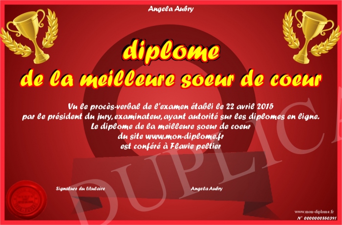 Envoyez par email votre diplôme de la meilleure soeur de coeur personalisé