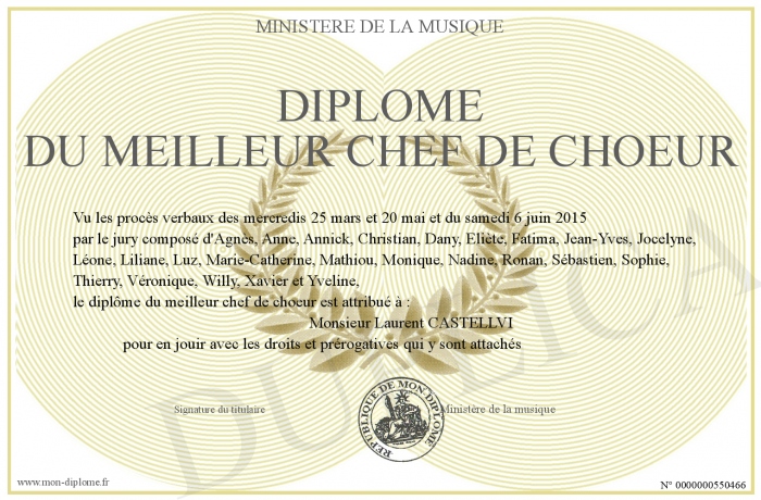 Envoyez par email votre Diplôme du meilleur chef de choeur personalisé