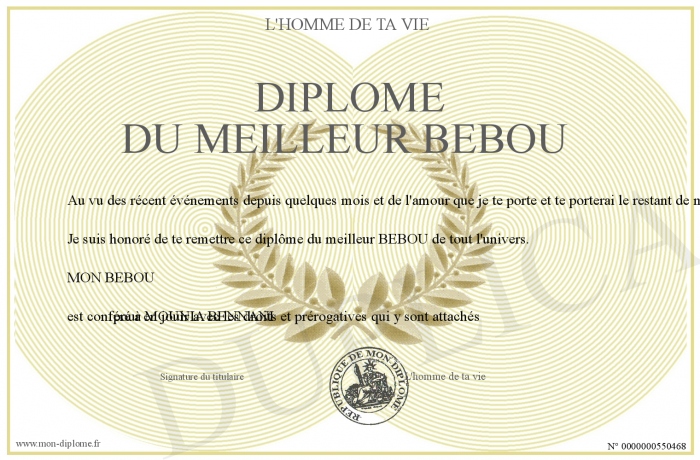 Envoyez par email votre Diplôme du meilleur BEBOU personalisé