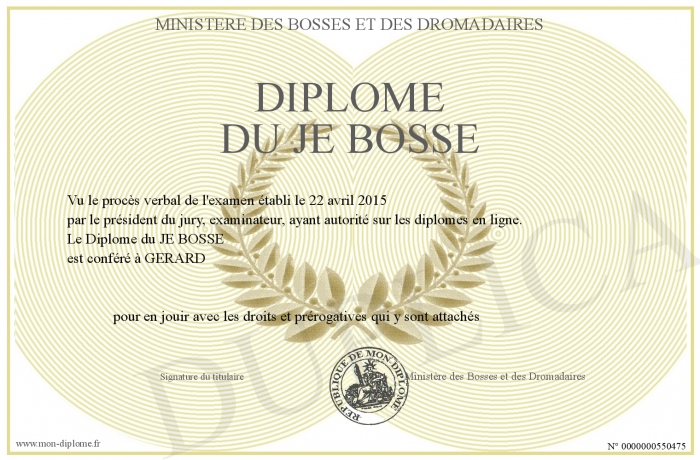 Envoyez par email votre Diplôme du JE BOSSE personalisé