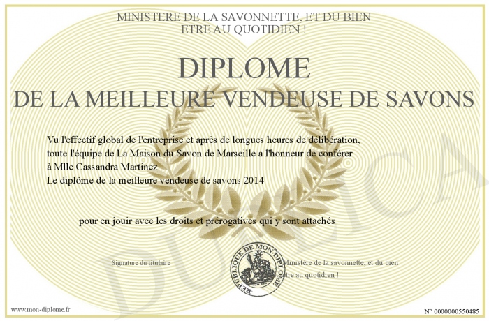 Envoyez par email votre Diplôme de la meilleure vendeuse de savons personalisé