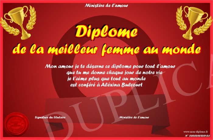 Envoyez par email votre Diplôme de la meilleur femme au monde personalisé