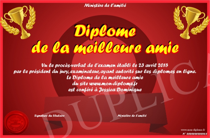 Envoyez par email votre Diplome de la meilleure amie personalisé