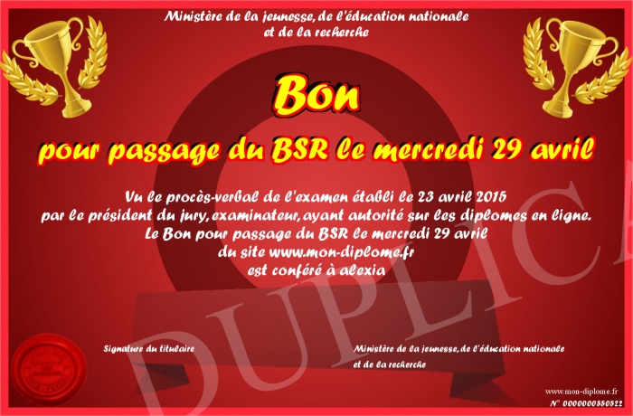 Envoyez par email votre Bon pour passage du BSR le mercredi 29 avril personalisé