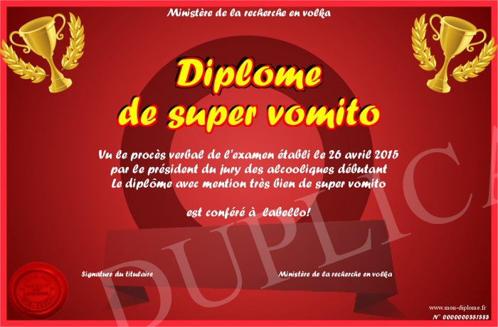 Envoyez par email votre Diplôme de super vomito personalisé