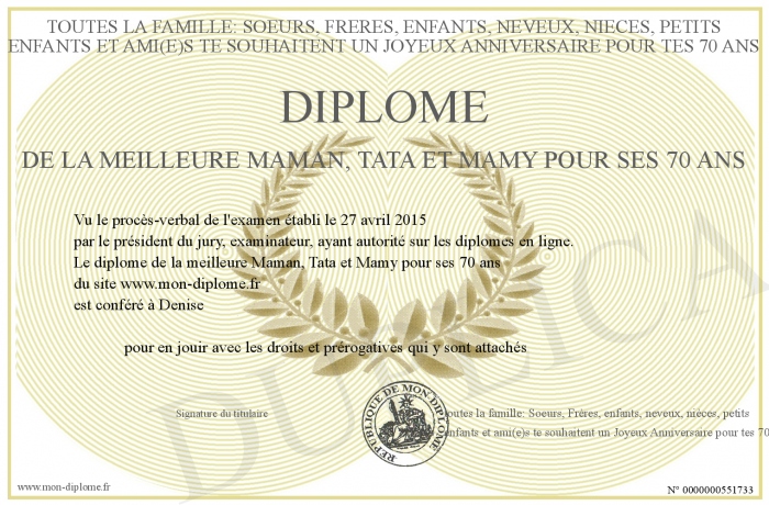 Envoyez par email votre diplôme de la meilleure Maman, Tata et Mamy pour ses 70 ans personalisé