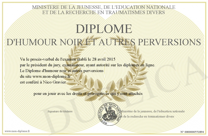 Envoyez par email votre Diplôme d'humour noir et autres perversions personalisé