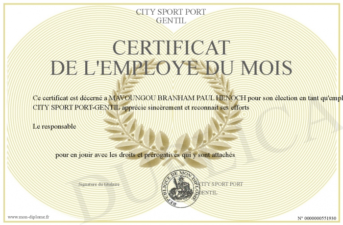 Envoyez par email votre CERTIFICAT DE L'EMPLOYE DU MOIS personalisé