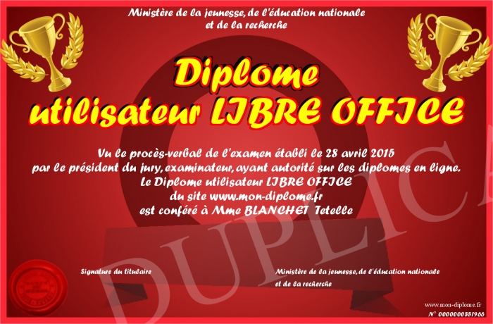 Envoyez par email votre Diplôme utilisateur LIBRE OFFICE personalisé