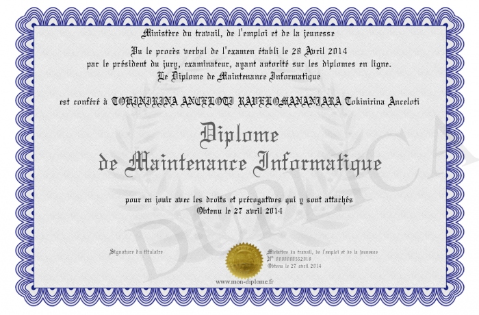 Envoyez par email votre Diplome de Maintenance Informatique personalisé