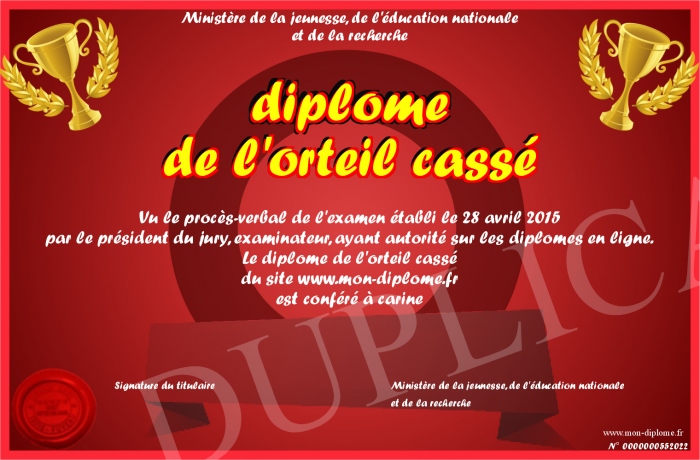 Envoyez par email votre diplome de l'orteil cassé personalisé