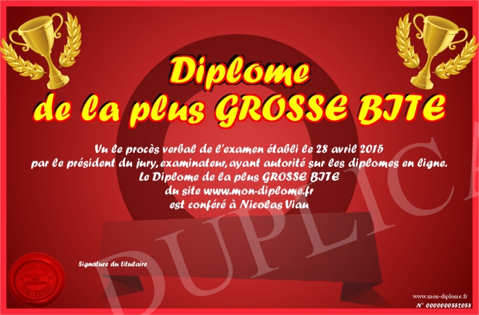 Envoyez par email votre Diplôme de la plus GROSSE BITE personalisé